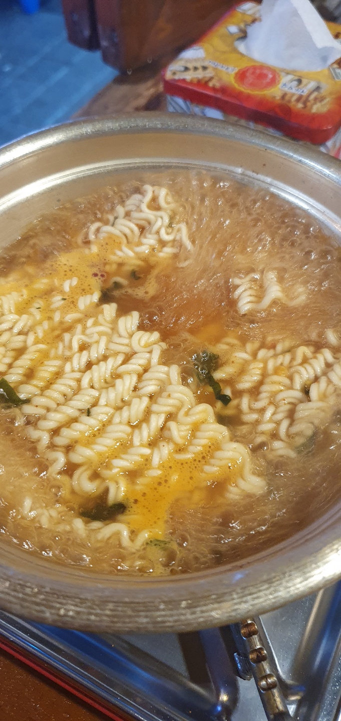 그런데 기본찬 술집 안주를 조금 기대하던 차에 나온 거라곤 아래 이미지처럼 양은냄비에 안성탕면 봉지라면 하나, 그리고 500mm 생수 한 병이었지요. 처음에 저는 순간 이건 뭐지? 우린 국물요리 안주도 안 시켰는데 왜 라면을 갖다 주지? 라며 조금 의외의 눈 빛으로 와이프와 서로를 쳐다보게 됐습니다. 그런데 자세히 봤더니 휴대용 버너도 갖다 주면서 끓여서 드시는 거라고 하면서 직원이 이야기를 해줬습니다. 그래서 찰나에 이거를 끓여야 되나 말아야 되나 고민이 조금 되었지만 바로 물을 붓고 끓이기 시작했습니다. 저는 평소에 라면은 신라면 건면만 즐기는 사람이고 안성탕면은 일부러 사 먹지도 않는 사람인데 여기까지 와서 이런 라면을 먹어야 되나 싶었는데 왠 걸요 이 라면이 이날의 분위기(비가 주적주적 내리는)와 가게 안 여러 가지 정서들과 너무 잘 어울리는 거 아니겠습니까.. 특히 안성탕면을 드셔 본 분들은 아시겠지만 특유의 구수하면서도 담백한 안성탕면의 국물이 안주로도 손색이 없는듯했습니다. 처음에는 라면이 너무 배부르게 하지 않을까 걱정했는데 두 사람이 몇 젓가락 건져먹으니 전혀 부담스럽지도 않았습니다. 더구나 저희가 시킨 골뱅이, 고갈비 안주들과 궁합도 잘 맞는 듯했습니다. 저는 개인적으로 음식도 참 궁합을 중요하게 생각하는 사람이거든요. 이 날 저는 사 먹는 안주는 평범하고 별로였던 반면 이 주점, 포차에서 끓여먹는 안성탕면 1 봉지가 너무 인상적이고 사람의 감성을 자극하는 이곳의 마케팅 '백미'다라는 생각까지 들 정도였습니다. 여러분들도 경험이 많으시겠지만 라면 1봉 지도 어디에서 어떤 날에 누구와 먹는지에 따라 그 맛과 감성이 천차만별인데 이런 돈 많이 안 드는 소소한 마케팅은 따라 해 봐도 괜찮겠다는 생각이 들었습니다. 혹시 주점, 포차 개업을 생각하시거나 기존에 하고 계신 사장님들 어떠세요? 끓여서 즉석에서 먹는 안성탕면 봉지라면 술집 마케팅