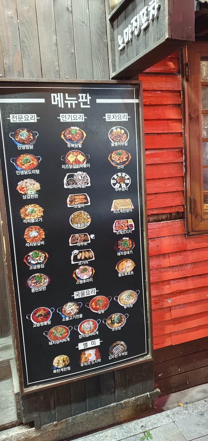 저는 평소 늘 어디를 가거나 무엇을 하든지 간에 마케팅적 관점에서 사물과 현상을 보고 관찰 내지는 분석해보는 것을 좋아합니다. 그것이 우리의 평소 일상과 밀접한 경우라면 더욱더 그렇지요. 지난 토요일 저녁에는 늦은 식사를 위해 옷을 주섬주섬 입고 흐린 날씨에 곧 비가 쏟아질 듯하여 우산도 하나 챙겨서 짝꿍과 동네를 나갔습니다. 원래는 가보려던 실내포차가 있었는데 비 오는 날씨에 걸어가기에는 거리가 좀 멀어 보여 가까운 곳을 들어갔고 포차였던 것 같습니다. 와이프와 저는 술보다는 안주를 늘 푸짐하게 여러 개 시켜놓고 즐겨먹는 걸 좋아해서 가게 앞 여러 안주가 이미지까지 잘 안내된 곳으로 갔는데 뭐 특별할 것 없는 조금은 시끌벅적한 곳이었지요. 그래도 다행히 저희 자리는 가게서 창가 자리 2군데 중 한 곳으로 앉게 되었고 바로 메뉴판이 나오자 골뱅이와 고갈비 그리고 막걸리를 한 병 시켰습니다.