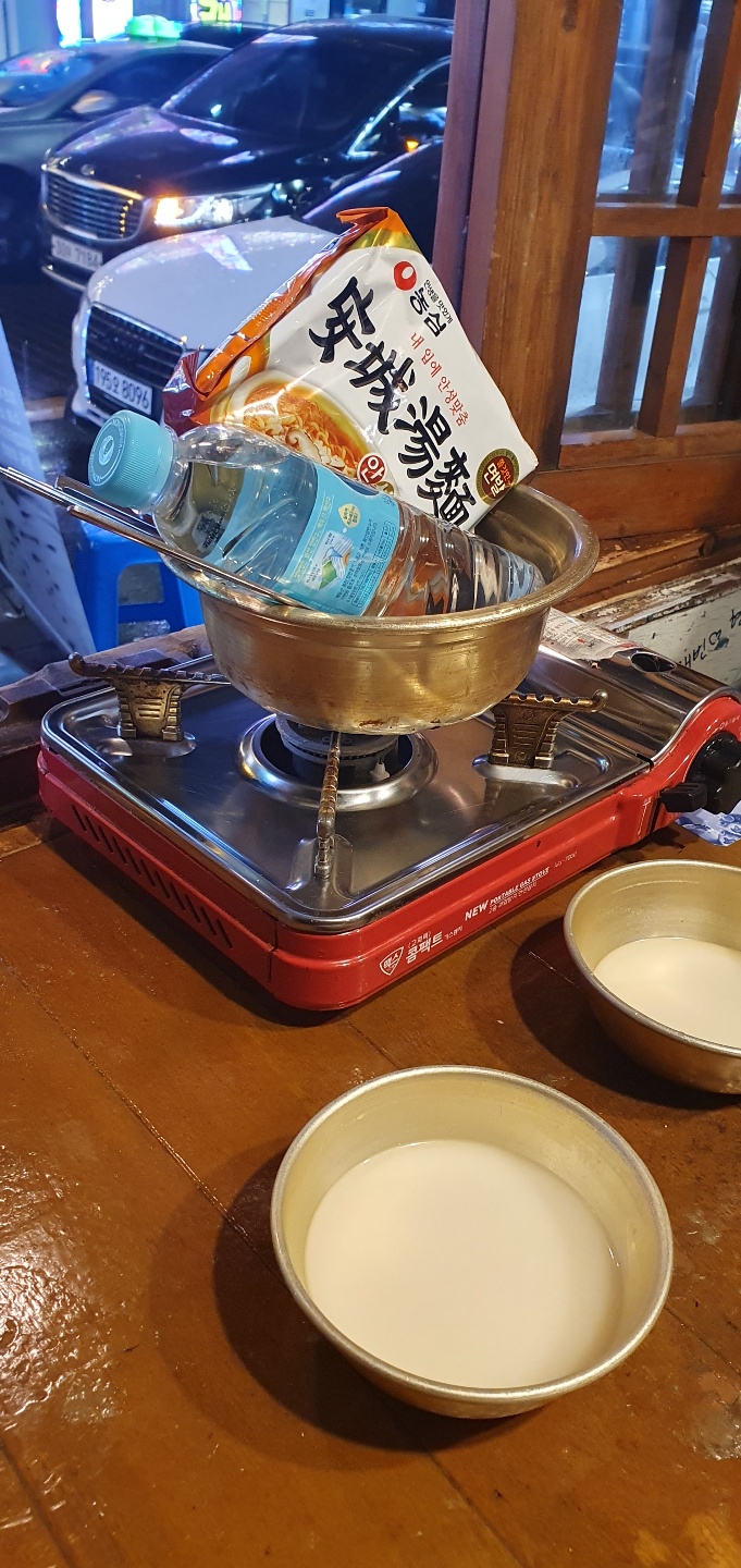 그런데 기본찬 술집 안주를 조금 기대하던 차에 나온 거라곤 아래 이미지처럼 양은냄비에 안성탕면 봉지라면 하나, 그리고 500mm 생수 한 병이었지요. 처음에 저는 순간 이건 뭐지? 우린 국물요리 안주도 안 시켰는데 왜 라면을 갖다 주지? 라며 조금 의외의 눈 빛으로 와이프와 서로를 쳐다보게 됐습니다. 그런데 자세히 봤더니 휴대용 버너도 갖다 주면서 끓여서 드시는 거라고 하면서 직원이 이야기를 해줬습니다. 그래서 찰나에 이거를 끓여야 되나 말아야 되나 고민이 조금 되었지만 바로 물을 붓고 끓이기 시작했습니다. 저는 평소에 라면은 신라면 건면만 즐기는 사람이고 안성탕면은 일부러 사 먹지도 않는 사람인데 여기까지 와서 이런 라면을 먹어야 되나 싶었는데 왠 걸요 이 라면이 이날의 분위기(비가 주적주적 내리는)와 가게 안 여러 가지 정서들과 너무 잘 어울리는 거 아니겠습니까.. 특히 안성탕면을 드셔 본 분들은 아시겠지만 특유의 구수하면서도 담백한 안성탕면의 국물이 안주로도 손색이 없는듯했습니다. 처음에는 라면이 너무 배부르게 하지 않을까 걱정했는데 두 사람이 몇 젓가락 건져먹으니 전혀 부담스럽지도 않았습니다. 더구나 저희가 시킨 골뱅이, 고갈비 안주들과 궁합도 잘 맞는 듯했습니다. 저는 개인적으로 음식도 참 궁합을 중요하게 생각하는 사람이거든요. 이 날 저는 사 먹는 안주는 평범하고 별로였던 반면 이 주점, 포차에서 끓여먹는 안성탕면 1 봉지가 너무 인상적이고 사람의 감성을 자극하는 이곳의 마케팅 '백미'다라는 생각까지 들 정도였습니다. 여러분들도 경험이 많으시겠지만 라면 1봉 지도 어디에서 어떤 날에 누구와 먹는지에 따라 그 맛과 감성이 천차만별인데 이런 돈 많이 안 드는 소소한 마케팅은 따라 해 봐도 괜찮겠다는 생각이 들었습니다. 혹시 주점, 포차 개업을 생각하시거나 기존에 하고 계신 사장님들 어떠세요? 끓여서 즉석에서 먹는 안성탕면 봉지라면 술집 마케팅