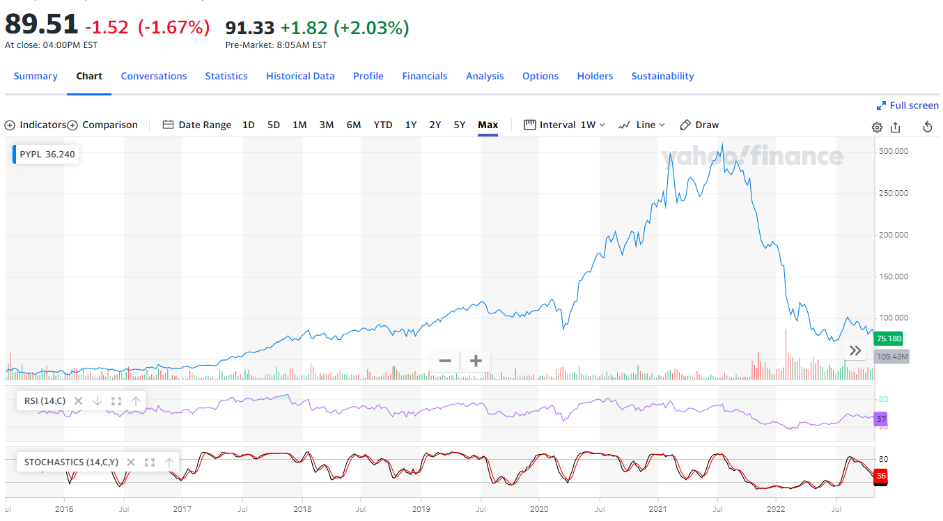 아래 차트를 보면 얼마나 많이 페이팔주가가 빠졌는지 한눈에 볼 수 있는데 코로나 발생 2020년 3월경 폭락장에 형성된 주가에서 맴돌고 있는 것을 볼 수 있습니다. RSI는 37, 스토캐스틱은 36 정도를 보이고 있는데 해당 보조지표들을 보면 분할 매수로 들어가기에도 나쁘지 않은 시점으로 보입니다. 하지만 경험상 더 떨어지기를 기다리고 있다가 갑자기 주가가 뛰어오르면 오른 주가에는 쉽게 매수 버튼에 손이 가지 않는다는 것입니다. 실물경제에 있어서 여러 가지 변수들이 산적해있다 보니 주가라는 것이 알 수가 없지만 그래도 어느 전문가의 말을 인용해보면 주가가 어떻게 움직일 것이라는 예측을 하고 들어가야 한다고 합니다. 여러분은 어느 방향으로 움직일 거 같으신가요? 성공적인 투자를 기원합니다.