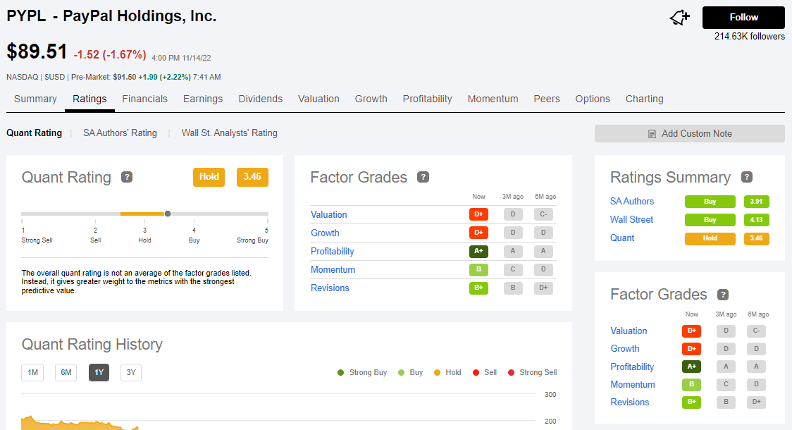 페이팔은 현재 지난 종가 기준 89.51불로 전체 퀀트레이팅 점수는 3.46으로 보류 포지션, SA전문가들은 3.91로 매수 포지션, 월가 전문가들은 현재 4.13으로 매수 포지션을 취하고 있습니다. 또한 지표를 간략하게 살펴보면 밸류에이션에서는 D+, 성장은 D+, 이익은 A+, 모멘텀은 B, 리비전은 B+를 받고 있습니다. 현재 밸류에이션 부문을 자세히 살펴보면 PE가 22.38로 지난 5년 평균 43.68보단 약 50% 정도 떨어지기는 했지만 여전히 섹터 메디안 수치 약 17보다는 아직 그래도 높은 밸류에이션을 보이고 있습니다. 그러나 아래 EPS 컨센서스를 보면 2031년까지 평균 약 19% 정도 성장을 할 거라는 전망을 하고 있습니다. 대충 계산을 해보면 연간 20% 가까운 성장을 하고 주식시장이 불마켓으로 전환이 되면 10년간 현재 주가의 3배 성장 전망치가 허무맹랑한 수치는 아니라는 계산이 나옵니다. 관련 상승여력 점검을 살펴보면 팁 랭스에서는 평균 21% 업사이드, 마켓 빗에서는 39% 업사이드를 예상하고 있습니다. 야후에서는 44명의 Analyst들 중 32명이 매수 포지션, 12명이 보류 포지션을 부르고 있습니다.
