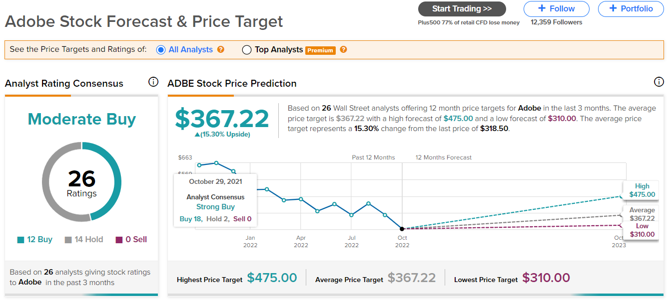 아래 어도비 주가전망을 보면 팁 랭스에서는 367달러로 약 15% 상승여력 포지션을 취하고 있고요