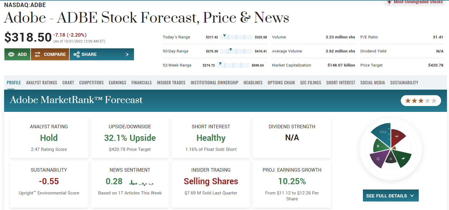 아래 어도비 주가전망을 보면 팁 랭스에서는 367달러로 약 15% 상승여력 포지션을 취하고 있고요