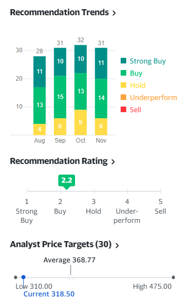 야후에서는 약 31명의 analyst 중 25명이 매수 포지션, 6명이 보류 상태로 최소 310에서 최대 475로 중간값 368을 타깃 프라이스로 보고 있습니다.