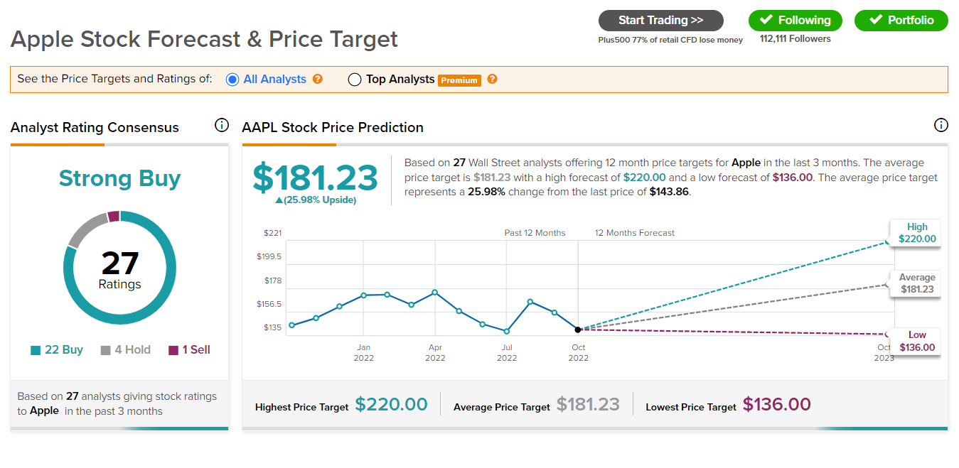 아래의 이미지를 보시면 애플 주식 주가 전망은 평균값이 약 181달러이고 이것은 팁 랭스에서 예상하는 수치입니다. 적게는 136달러 많게는 220달러를 보고 있는데요. 약 27명의 analyst 사이에서 22명이 '강력 매수'를 외치고 있습니다. 마켓 비트에서도 약 180달러를 애플 타깃 프라이스로 보고 있는 점도 눈여겨봐야겠습니다. 미국 주식시장이 장기적 관점에서 볼 때는 항상 우상향 한다는 특징이 바로 애플을 두고서 하는 말이 아닌가 싶은데요