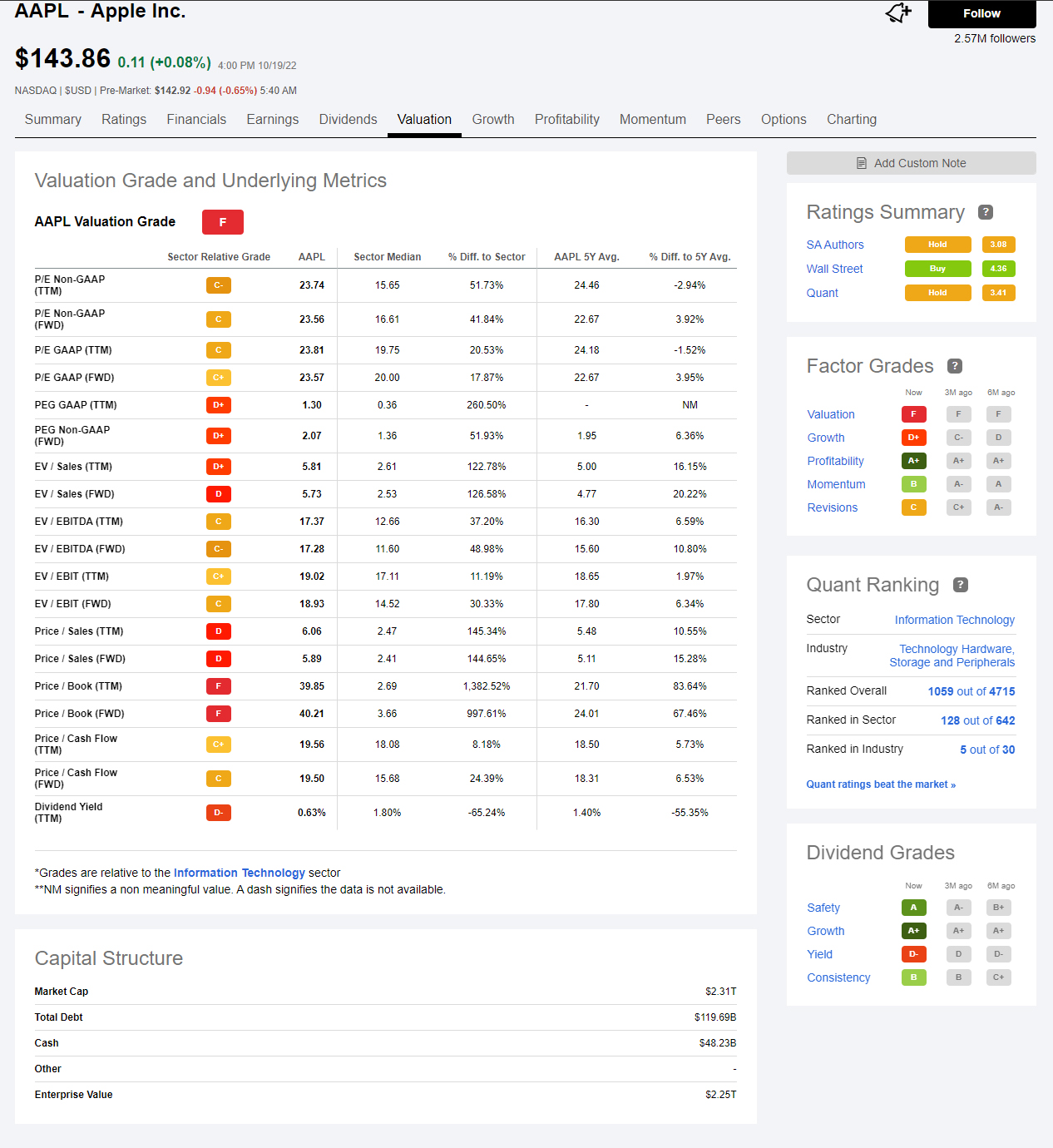 하지만 이런 대단한 애플 주식도 현재의 밸류에이션을 보면 아래와 같이 좋지 않은 점수를 받고 있습니다. 여타의 기술기업들이 주가가 반토막 이상 난 기업들이 수두룩한 상황에서 이 정도면 그래도 꽤 선방을 하고 있는 것이지요.. 참고로 아래의 애플 주식 가치평가는 시킹알파 프리미엄 회원에서 볼 수 있는 부분을 캡처해서 올린 것이니 여러분들 투자에 조금이라도 도움이 되었으면 좋겠습니다.