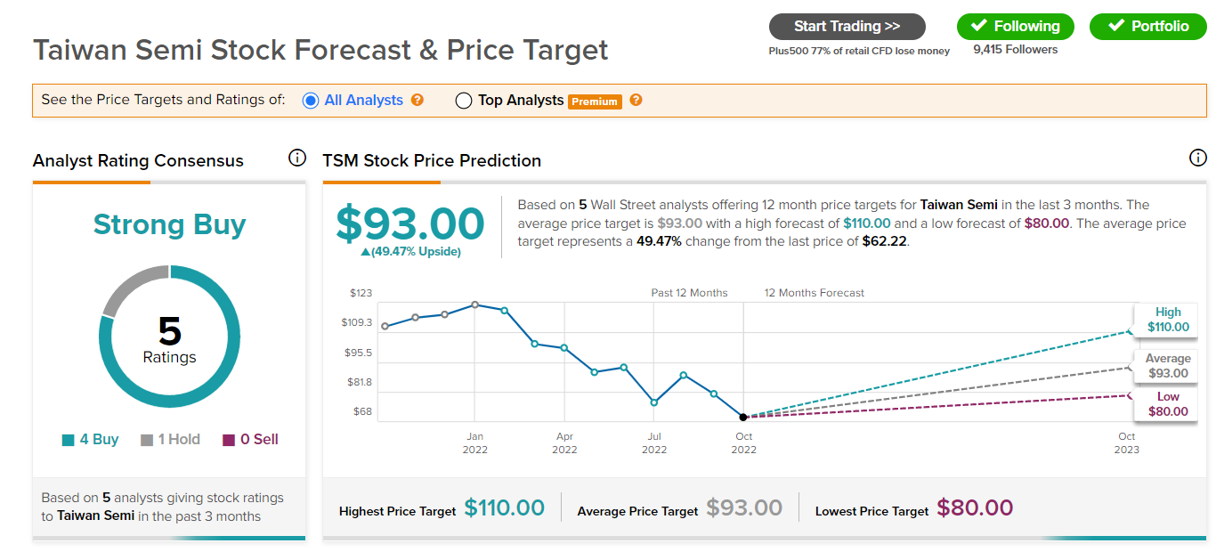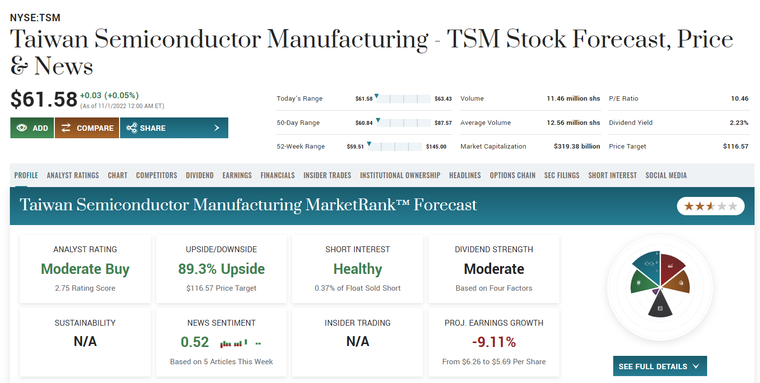 tsmc의 주가는 현재 팁 랭스에서는 최소 80, 최대 110불로 중간값 93불로 약 49% 상승 예상 포지션을 보이고 있습니다.