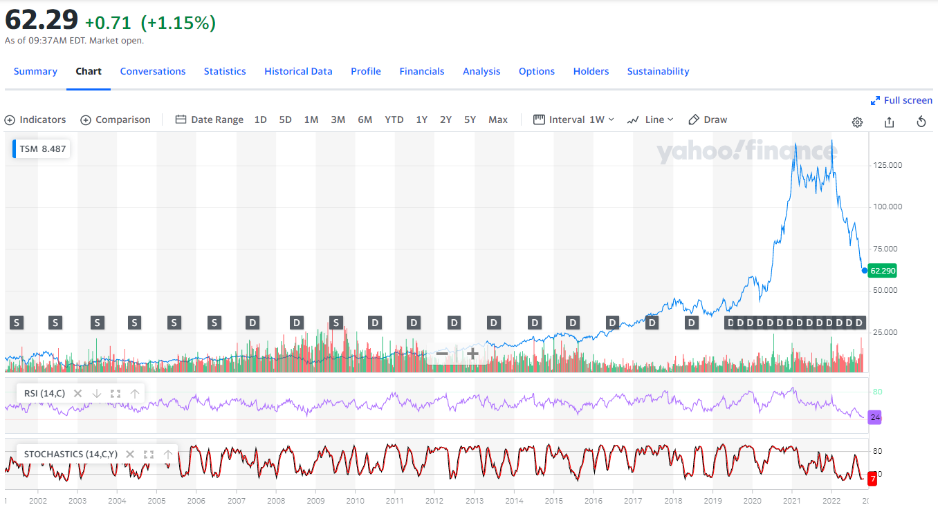 tsmc는 현재 지난 종가 기준으로 61달러인데 이는 52주 신고가보다 약 -46% 정도 빠져있는 상태입니다.