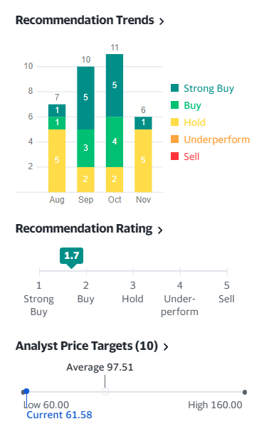 전문가들도 5명 중 4명이 매수, 1명이 보류 포지션이고요, 아래 마켓 빗에서는 평균 116달러로 약 89% 상승여력이 있다고 보다 후한 점수를 받고 있습니다.