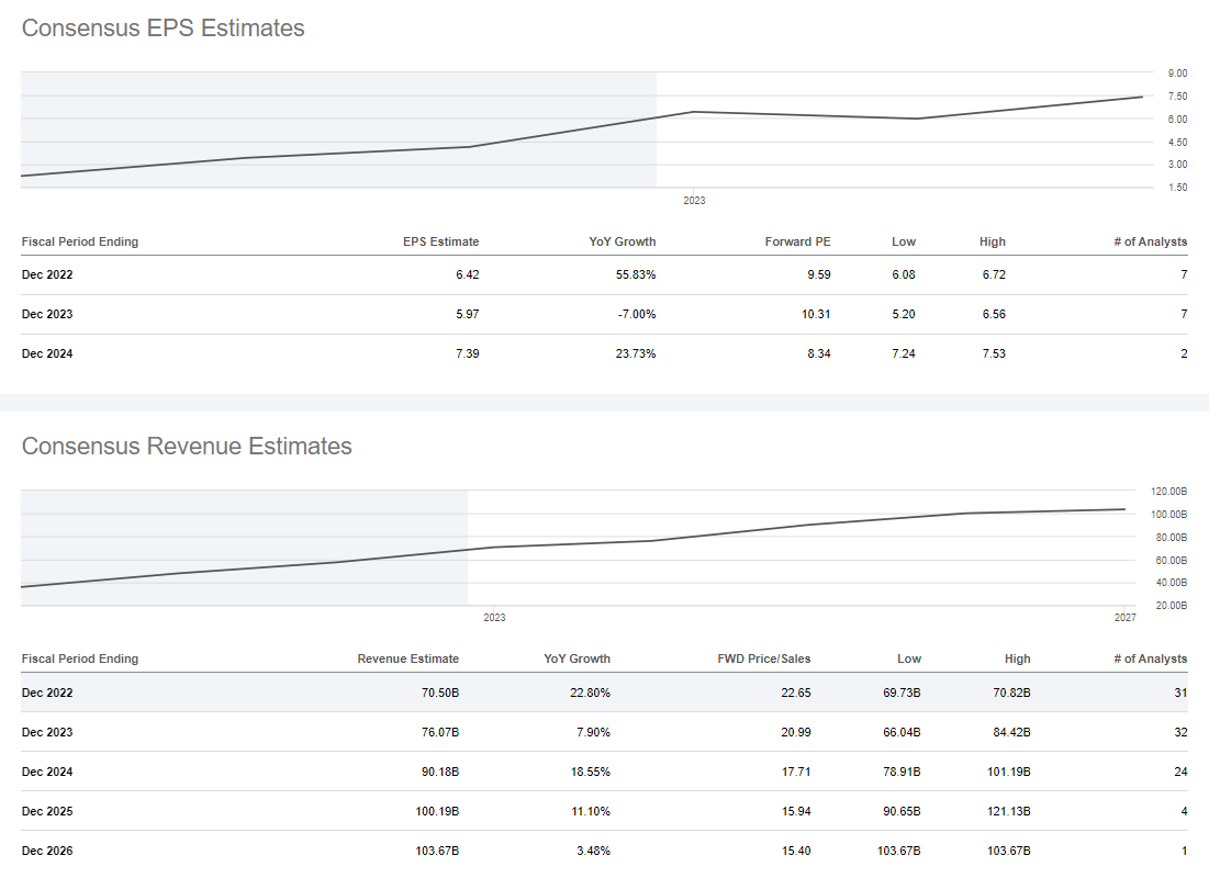 하지만 아래 그림 매출 추정치로 보면 23년도 매출도 약 7.9% 성장을 할 것으로 보는 시각이 있는데요, 매출은 소폭 성장하지만 EPS는 역성장할 수도 있다는 근거는 벌어서 투자나 기타 비용에 자본투입이 많을 것이다라는 예상을 해볼 수 있겠습니다.