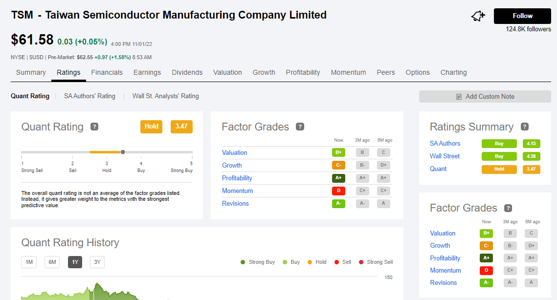 총마진이 약 57%로 지난 5년 평균값 50%보다 약 7% 더 상승했고요, 영업이익도 약 47%로 지난 5년 평균값 39%보다 약 8% 더 증가를 했습니다. 그럼에도 불구하고 현재 TSM은 모멘텀에서 D점수를 받고 있는데요, 이는 여러 가지 요인이 있겠지만 전쟁, 공급망 불안으로 인한 관련 기업들의 매출 감소로 인해 반도체 디맨드가 불확실하고 장기재고가 넘치는 일부 요인도 한몫을 하고 있는 듯합니다.