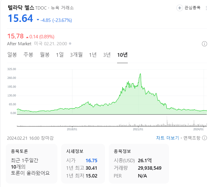 텔라닥 주가와 연관된 재무 분석 (2024년 2월 22일 기준)