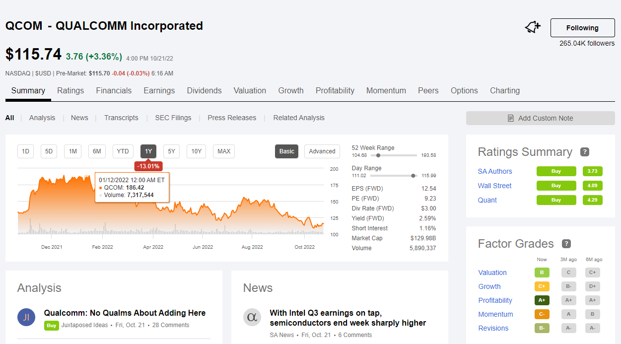 현재 퀄컴(qcom)의 전일 종가는 115달러로 시킹알파 전문가 집단과 월스트리트, 퀀트점수 모두 매수 점수를 받고 있는 매우 우량한 기업이라고 할 수 있겠습니다. 국내 경제, 증권 관련 방송에서 한 펀드매니저는 퀄컴을 상승여력이 300%가 넘는다는 종목 분석을 본 적이 있는데 그만큼 투자할만한 , 주목해볼 만 기업이니까 그런 평가를 가지고 와서 방송을 하고 있겠지요. 하지만 대내외적인 여러 여건상 실제로 퀄컴 주가는 그리 상승하고 있지 못하고 있습니다.