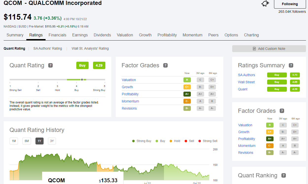 퀀트 레이팅 점수가 퀄컴의 경우 4.29점으로 나오는데요. 이 정도 점수는 정말 흔하지 않은 점수의 미국 주식 기업인 것 같아요. 더구나 이 평가가 단기간에 이뤄진 점수가 아니라 그동안 쭈욱 이런 점수대와 평가를 유지하고 있다는데 또 의미가 있는 것 같습니다.