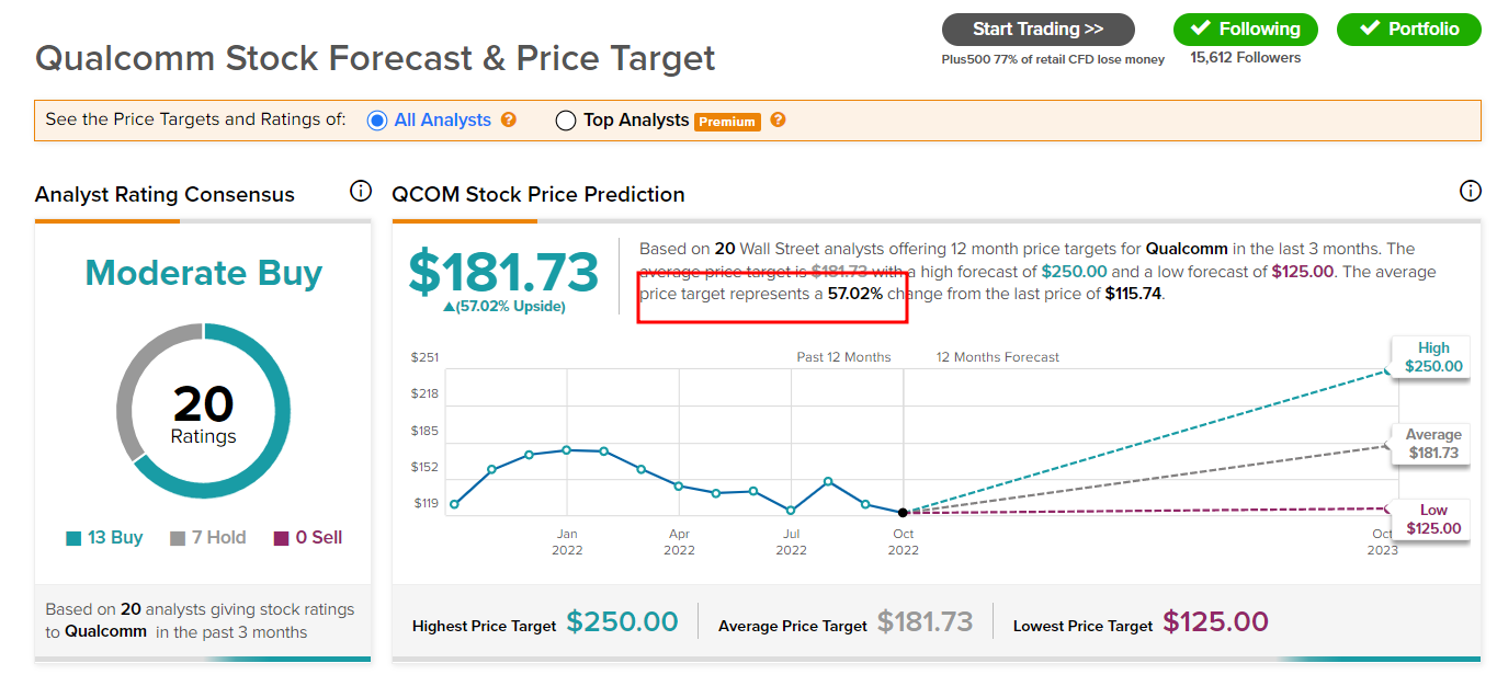 퀄컴 주가는 확실히 전망치도 나쁘지 않은 게 팁 랭스에서는 평균 57% 이상 상승여력이 있다고 나오고 있고 최소 125, 최대 약 250불 정도 예상하고 있는 전문가들이 있습니다. 20명의 전문가 평가 중 13명은 매수, 7명은 홀드, 매도 주문은 없군요