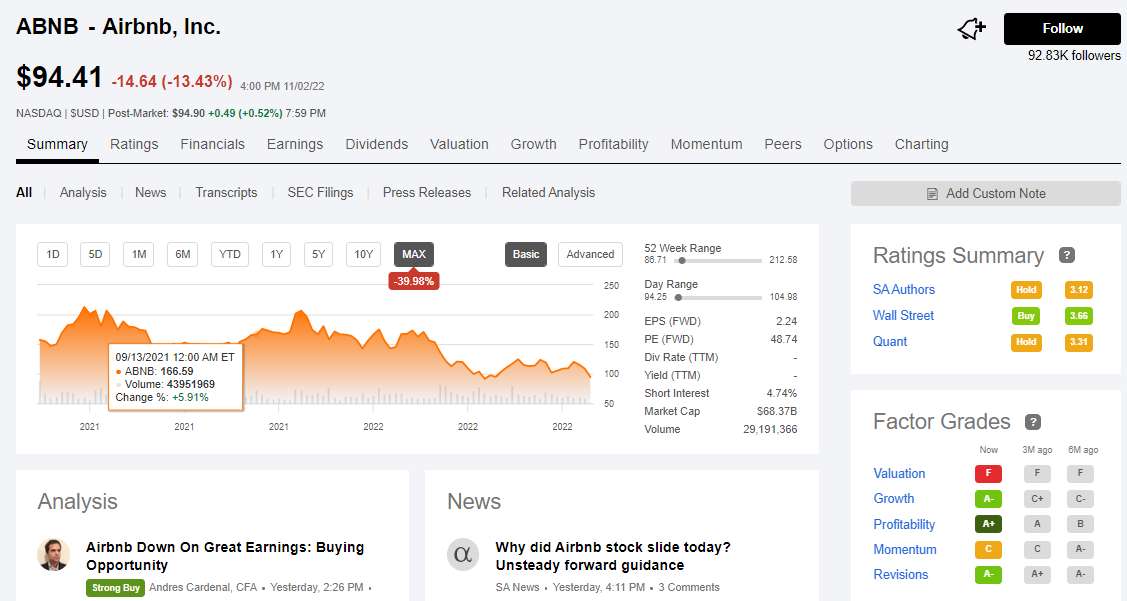여행을 좋아하거나 관심 있는 분들이라면 에어비앤비를 모르는 분들이 없을 것 같습니다. 오늘은 에어비앤비 주식을 가지고 한번 살펴보는 시간을 가져보겠습니다. 아래 그림에서 보는 바와 같이 에어비앤비는 지난 종가가 100불 아래로 떨어져 94달러에 마-감을 했는데요, 2022년도 Q3최대 분기 실적을 내고도 약 13%가량 흘러내렸습니다. 3분기에는 약 29억 달러의 매출과 12억 달러의 순이익을 발표했는데요 이는 지난해 같은 기간보다 약 매출은 29%, 순이익은 45% 정도 증가한 수치입니다. 보통 이 정도 실적 발표를 했다면 상승 모멘텀을 타고 주가 상승을 한다는 스토리가 당연한 것처럼 받아들여지는데 왜 이렇게 많이 떨어졌을까요? 알고 보니 발목을 잡은 것은 4분기 실적 전망이 인플레이션, 경기침체, 그리고 숙박료 상승 등으로 에어비앤비 실적에 부정적 영향을 끼칠 거라는 전문가들의 분석이 있었건 것으로 보입니다. 자세한 내용은 아래 퀀트분석 자료들을 보고 다시 짚어보겠습니다. 현재 에어비앤비는 퀀트 분석에서는 3.31로 보류 포지션, SA전문가들은 3.12로 동일하게 보류 포지션, 월가 전문가들은 3.66으로 매수 포지션을 취하고 있습니다. 확실히 월가 쪽 사람들이 더 후한 평가와 점수를 주고 있습니다.