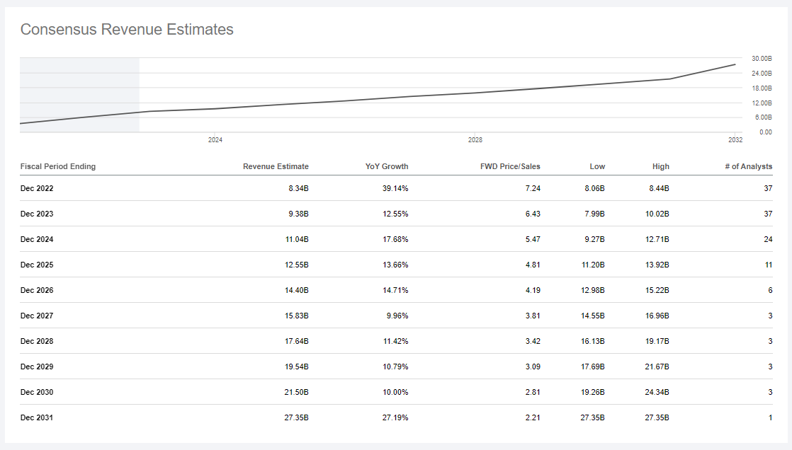 아래 매출 예상 추정치를 연도별로 보면 2023년도도 성장률이 올해 2022년도 보다는 많이 떨어지지만 약 12% 성장을 할 것이라는 37명의 analyst 분석 수치가 있습니다.