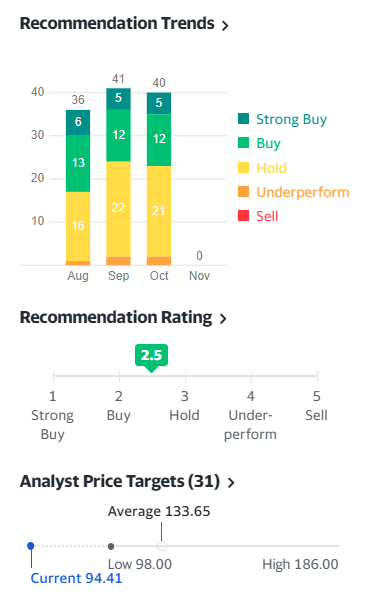 그에 발맞춰 팁 랭스에서는 최소 98, 최대 165로, 중간 값 131.95불로 약 39% 상승여력이 있다고 보고 있습니다.