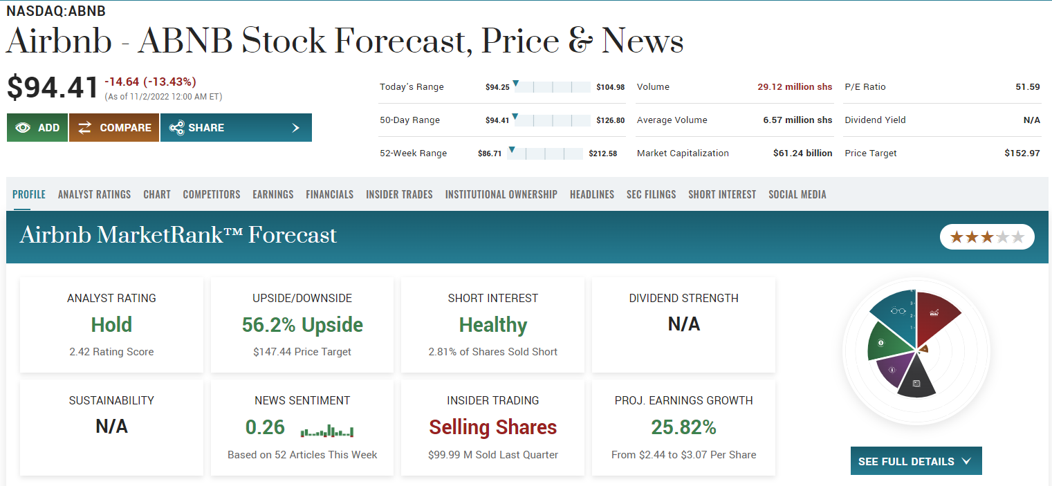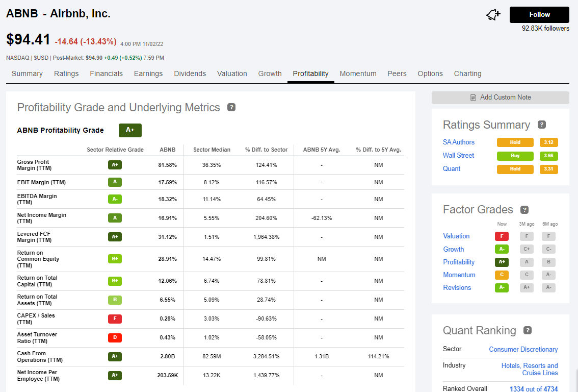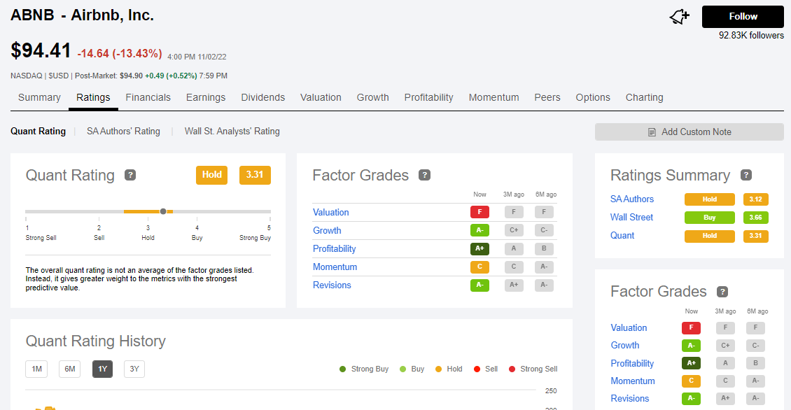 여행을 좋아하거나 관심 있는 분들이라면 에어비앤비를 모르는 분들이 없을 것 같습니다. 오늘은 에어비앤비 주식을 가지고 한번 살펴보는 시간을 가져보겠습니다. 아래 그림에서 보는 바와 같이 에어비앤비는 지난 종가가 100불 아래로 떨어져 94달러에 마-감을 했는데요, 2022년도 Q3최대 분기 실적을 내고도 약 13%가량 흘러내렸습니다. 3분기에는 약 29억 달러의 매출과 12억 달러의 순이익을 발표했는데요 이는 지난해 같은 기간보다 약 매출은 29%, 순이익은 45% 정도 증가한 수치입니다. 보통 이 정도 실적 발표를 했다면 상승 모멘텀을 타고 주가 상승을 한다는 스토리가 당연한 것처럼 받아들여지는데 왜 이렇게 많이 떨어졌을까요? 알고 보니 발목을 잡은 것은 4분기 실적 전망이 인플레이션, 경기침체, 그리고 숙박료 상승 등으로 에어비앤비 실적에 부정적 영향을 끼칠 거라는 전문가들의 분석이 있었건 것으로 보입니다. 자세한 내용은 아래 퀀트분석 자료들을 보고 다시 짚어보겠습니다. 현재 에어비앤비는 퀀트 분석에서는 3.31로 보류 포지션, SA전문가들은 3.12로 동일하게 보류 포지션, 월가 전문가들은 3.66으로 매수 포지션을 취하고 있습니다. 확실히 월가 쪽 사람들이 더 후한 평가와 점수를 주고 있습니다.