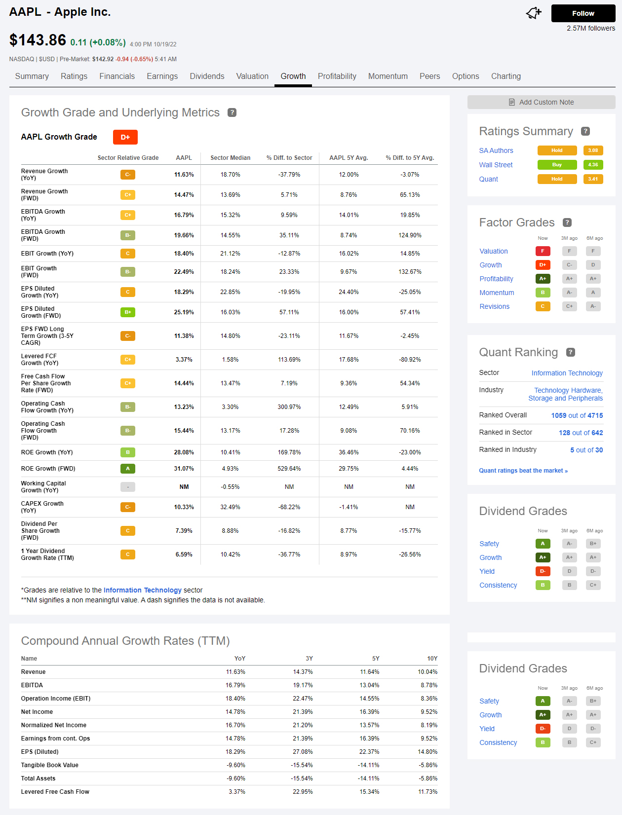 아래 이미지는 애플 주식의 성장 부분에 대한 수치적 분석입니다. 전체적인 등급은 D플러스를 받고 있는 점이 눈여겨볼 부분인데 바로 이런 부분 때문에 애플이 애플 카를 수년 여전부터 야심 차게 준비하고 있는 게 아닌가 하는 생각이 듭니다. 만약에 정말 애플이 애플 카를 통해 성공적으로 자동차 시장과 자율주행 시장의 상당 부분을 차지하게 된다면 다시금 한번 애플 전성기를 맞이하게 되지 않을까 하는 조심스러운 추측을 해봅니다.