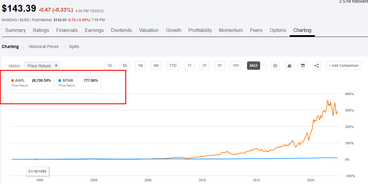 아래 이미지에서 S&P 500의 최근 약 20여 년을 두고서 차트를 비교해보면 애플 주가(AAPL)는 같은 기간 약 28,000배의 주가 우상향이 있었고 S&P 500은 777%의 우상향을 그리고 있는 점에서 볼 때 매우 시사하는 바가 큰 것을 봅니다. 그만큼 애플은 미국 시장뿐 아니라 전 세계 자본, 주식시장에서 빼놓을 수 없는 기둥과 같은 회사, 주식이라는 것을 새삼 느낍니다. 이상으로 간략히 애플(AAPL) 주식을 애플 카에서부터 애플 주가전망까지 해봤는데 앞으로도 주목할 만한 소식이나 정보가 있다면 다시 찾아뵙겠습니다.