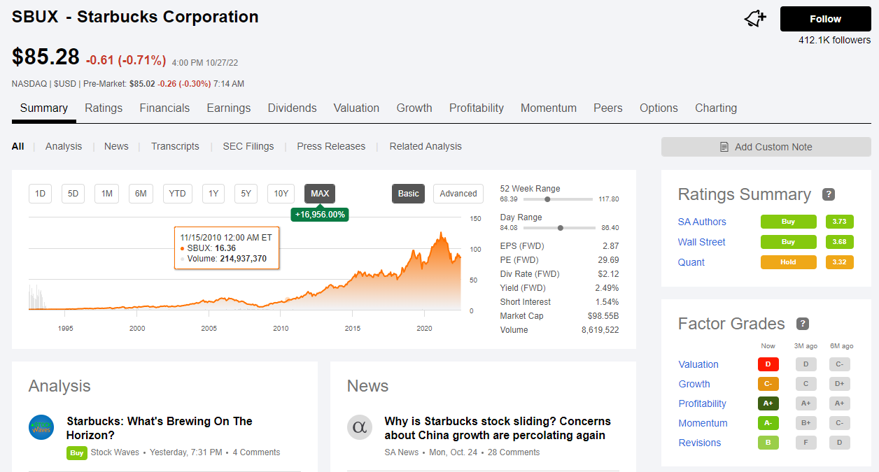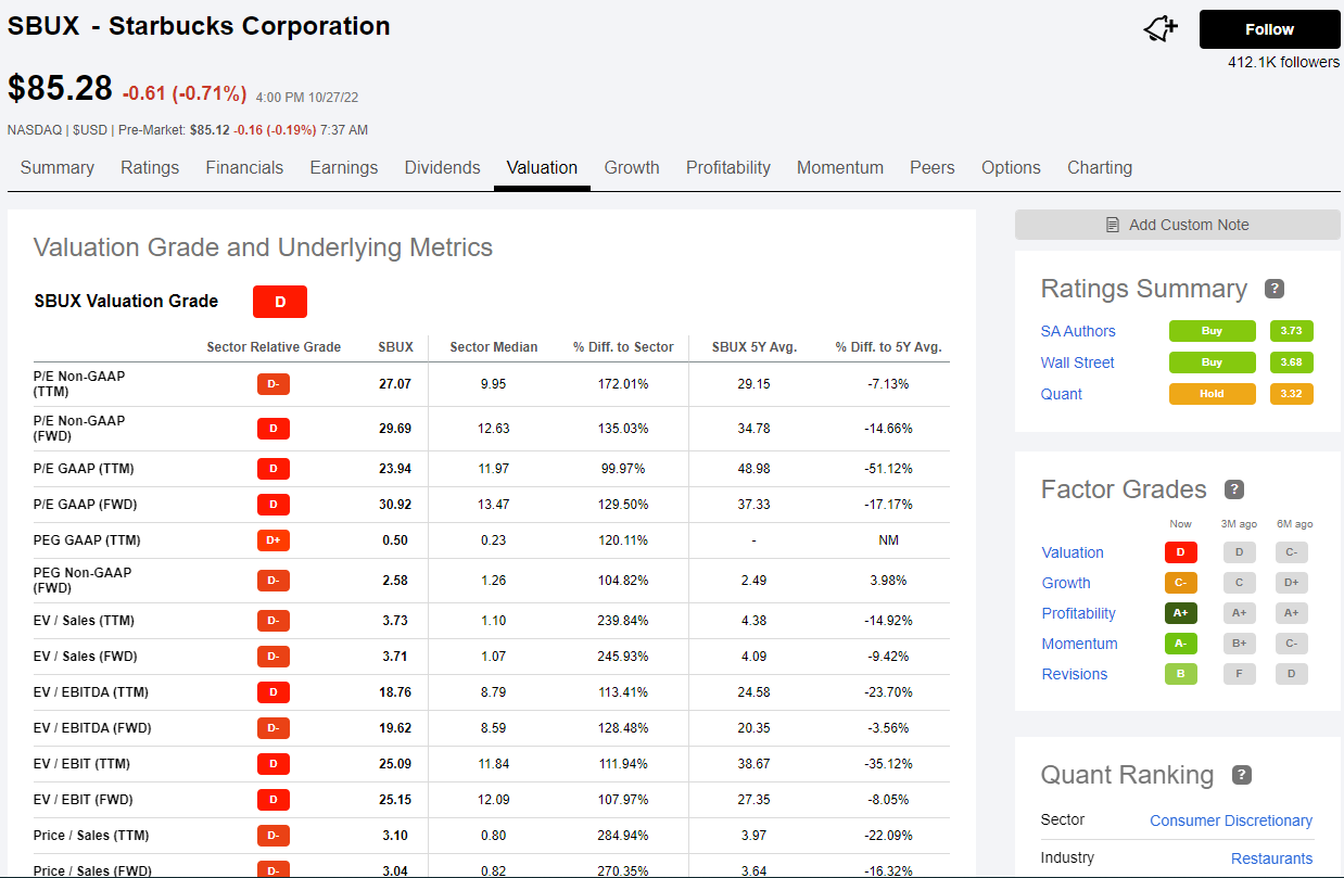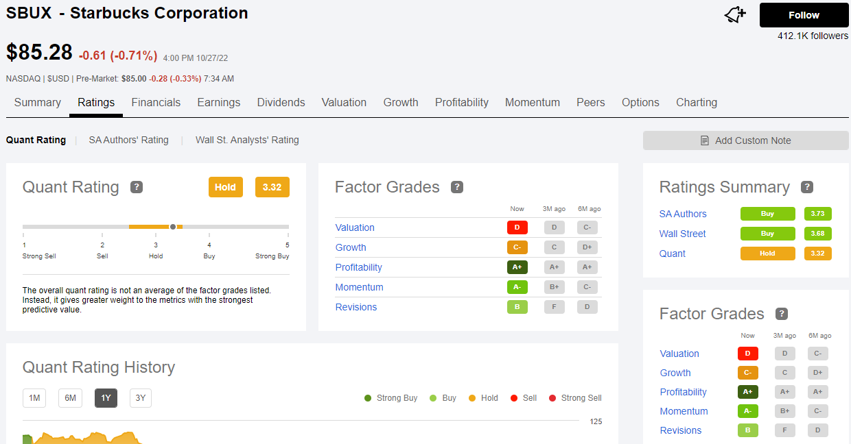 스타벅스 주가가 지난 종가 현재 85.28달러인데 한국돈으로 환산하면 약 12만 원 정도 합니다. 퀀트 레이팅을 살펴보면 보류 상태로 3.32 점수를 평균값을 받고 있고 sa전문가들은 매수로 3.73, 월가 전문가들은 3.68로 매수를 주문하고 있습니다. 전체적인 팩터 요소들을 보면 밸류에이션은 D, 성장은 C-,이익은 A+, 모멘텀은 A-,리비전은 B를 받고 있습니다.