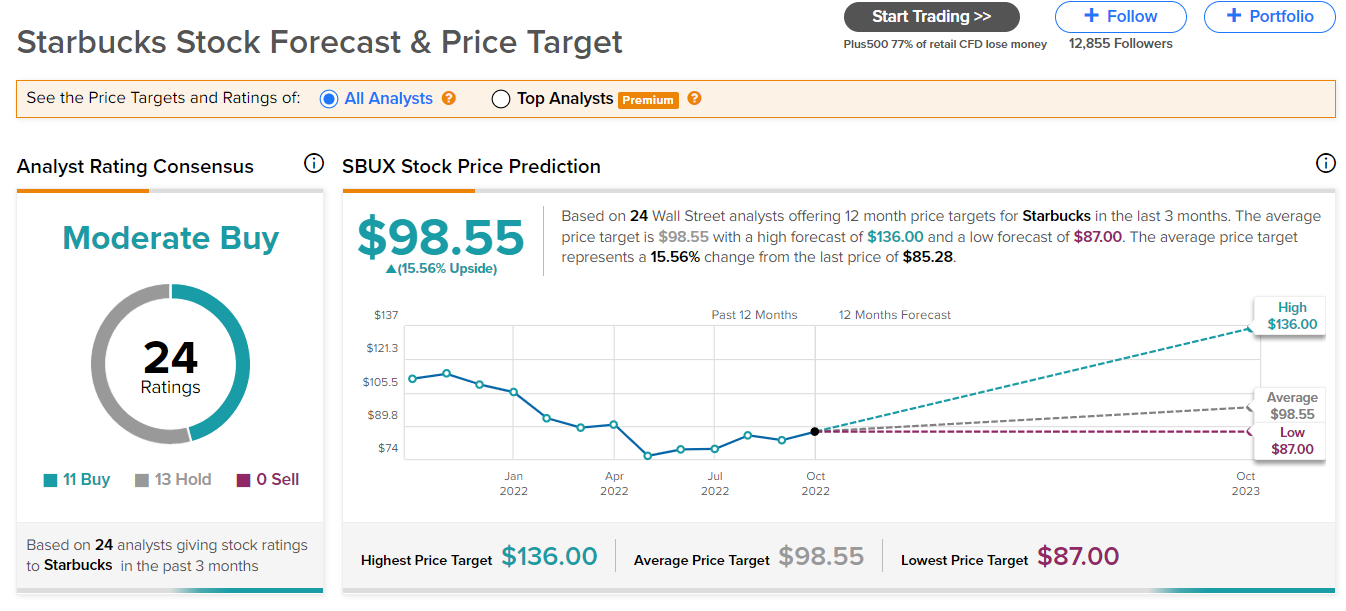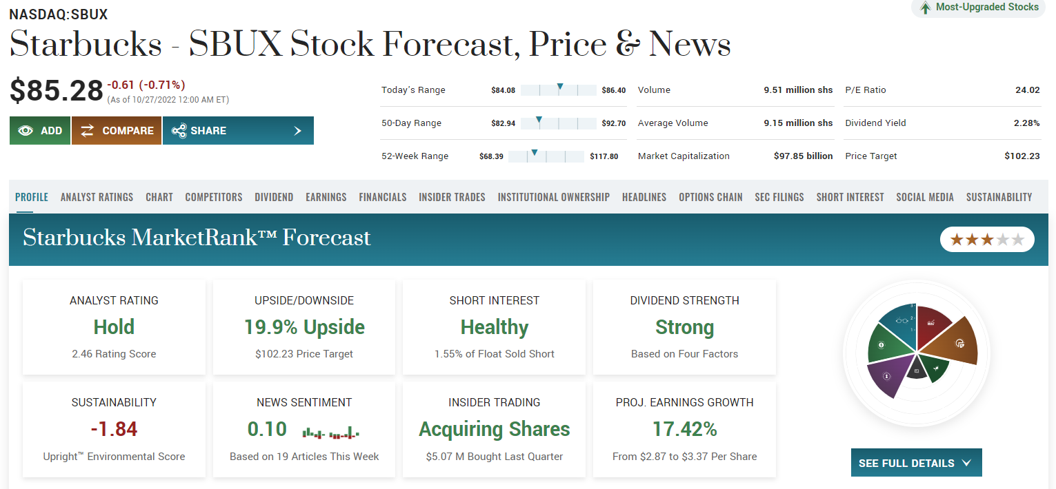 이제는 스타벅스 주가전망을 살펴보겠습니다. 팁 랭스에서는 최소 87달러, 최대 136달러, 중간값이 98.55달러로 약 15% 업사이드 상승여력을 예상하고 있습니다. 마켓 빗에서는 평균값이 102달러로 약 19% 상승을 예상하고 있는데요, 팁 랭스보다는 더 후한 점수를 주고 있습니다.