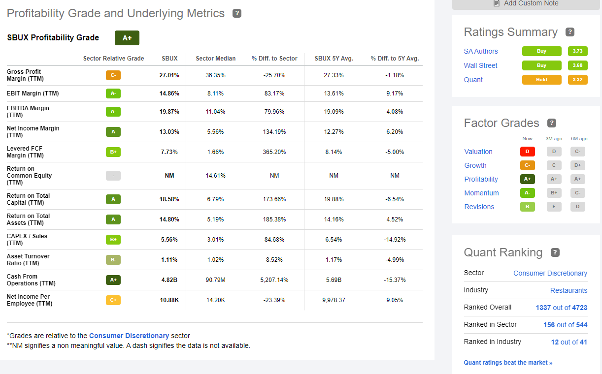 그럼에도 불구하고 스타벅스 주식의 경우 이익은 전체 등급에서 A+를 받고 있는데요. 순이익이 약 13%로 동종업계의 약 2배가 넘는 우수한 평가를 받고 있습니다.